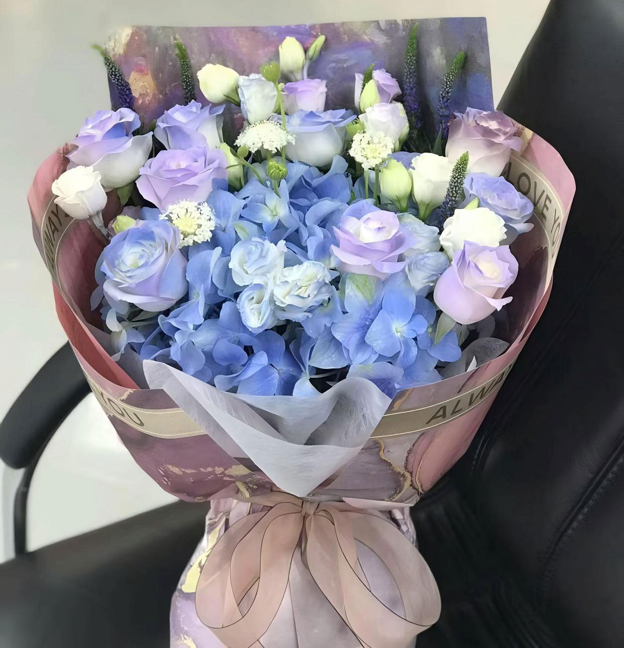 輕霧紫玫瑰藍色繡球花束